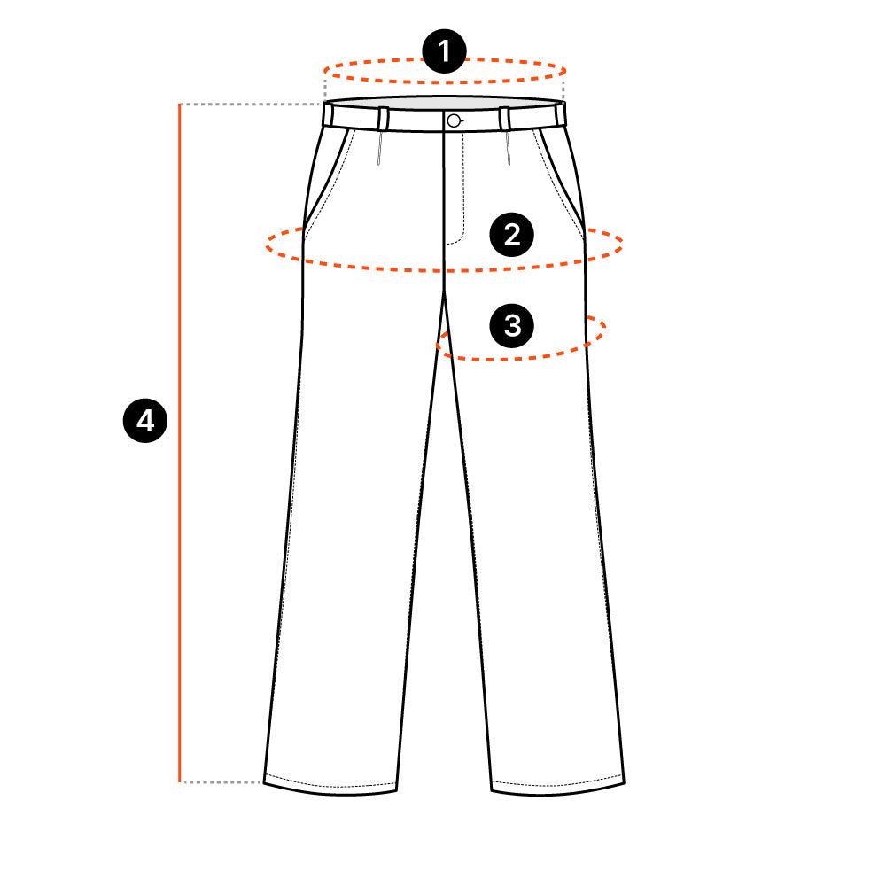 1. Waist Measure your waist at the thinnest place. 2. Hip Measure the fullest part of your hip. 3. Thigh Measure the circumference around the fullest part of your thigh. 4. Total length Measure from the waistband to the leg opening or hem. |