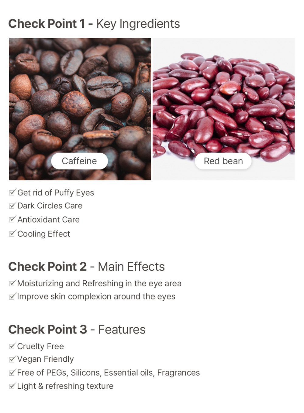 - Caffeine helps reduce puffiness and revitalizes tired-looking eyes.