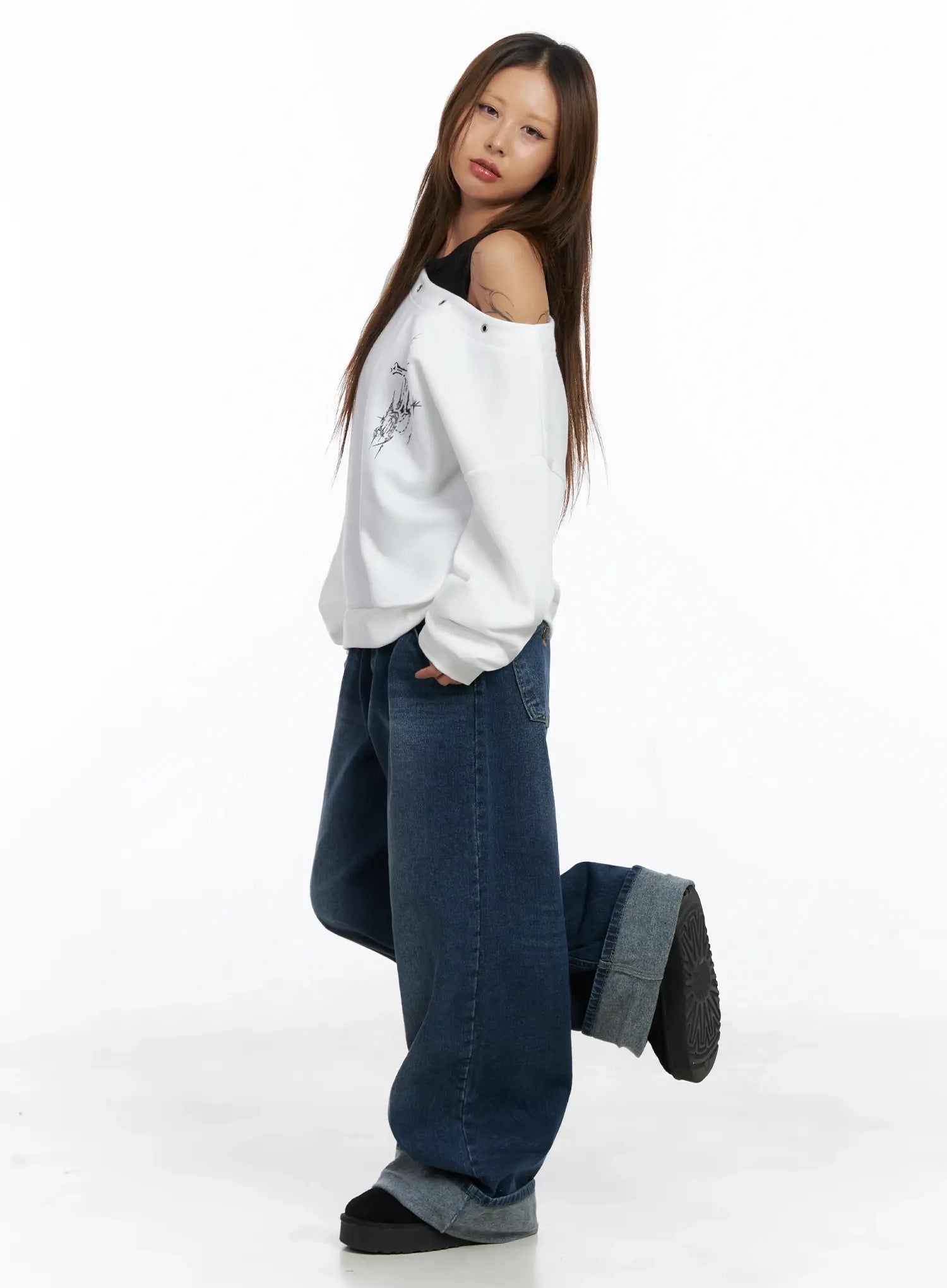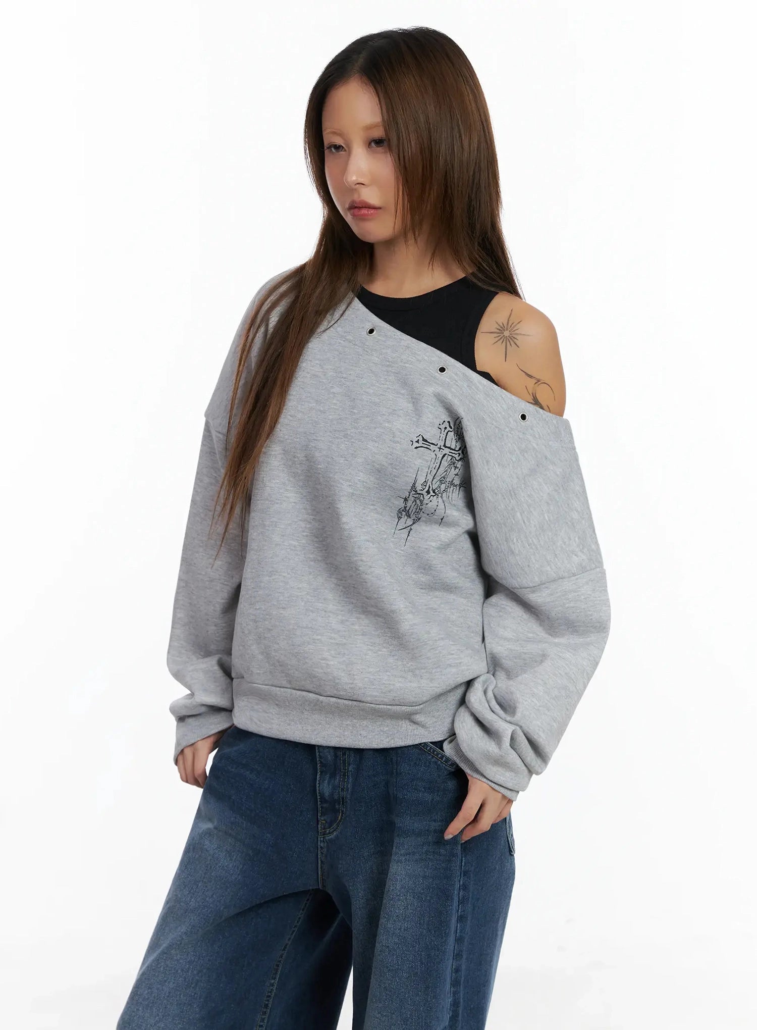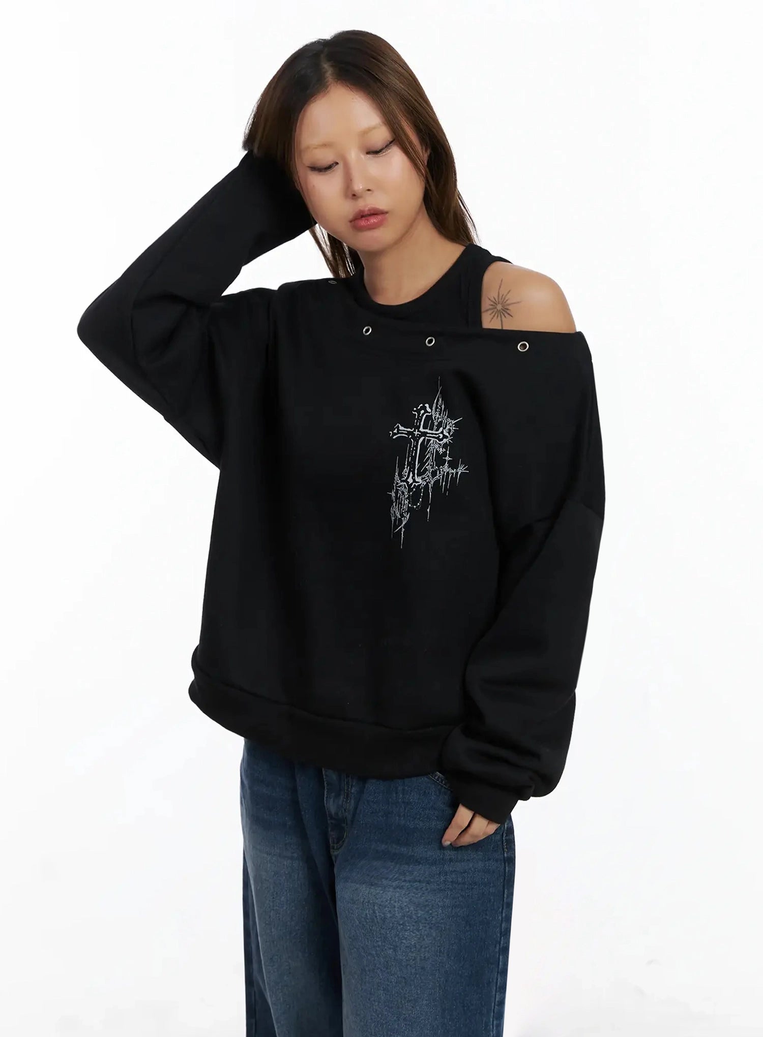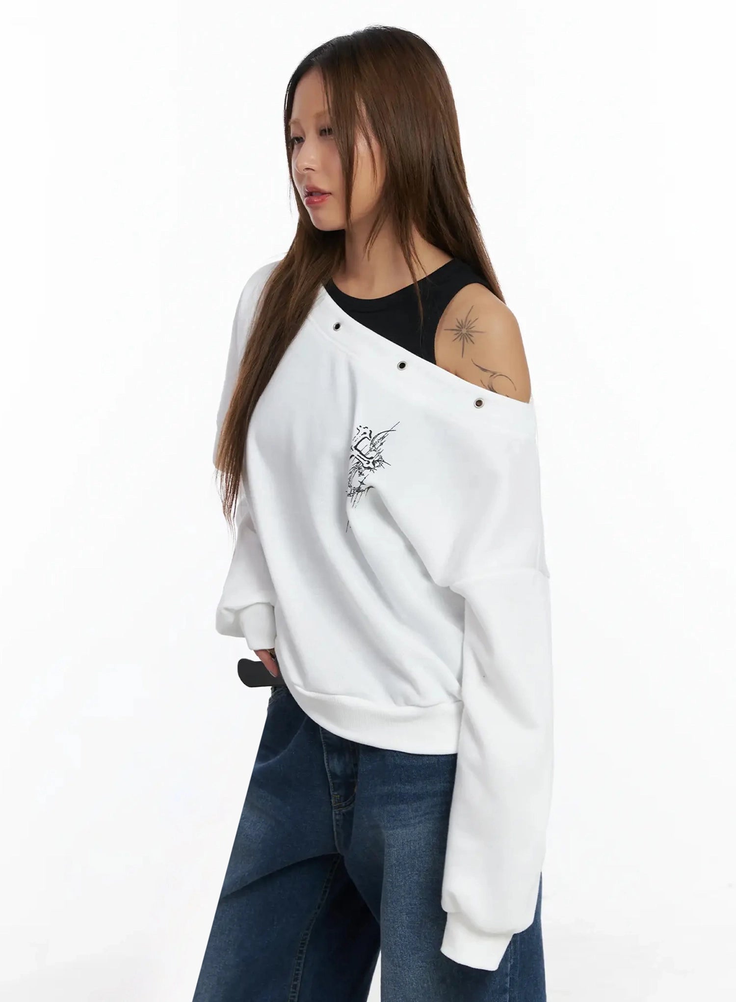 Off-Shoulder Eyelet Graphic Sweater IN528